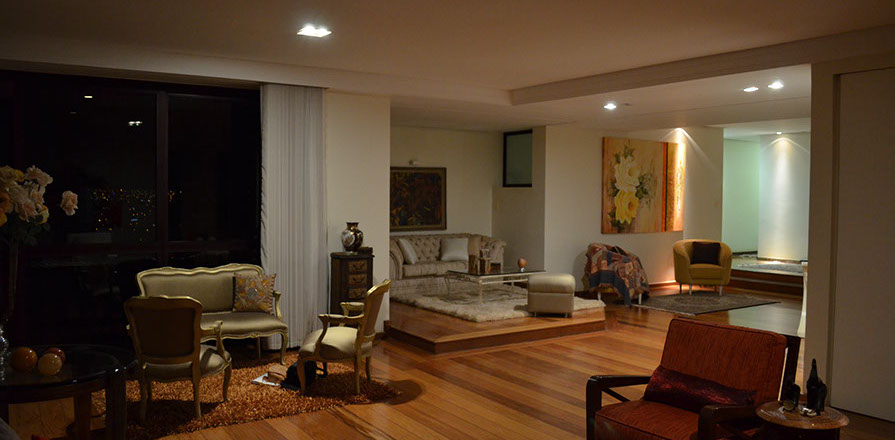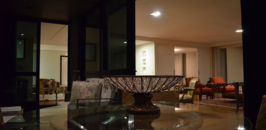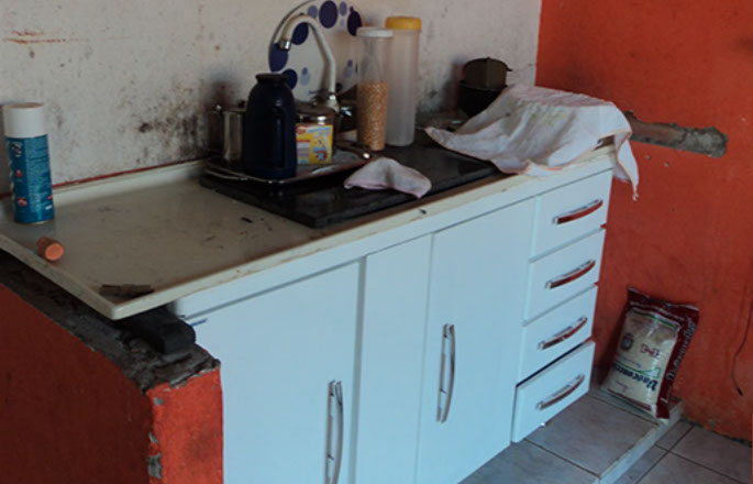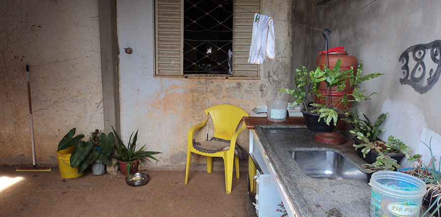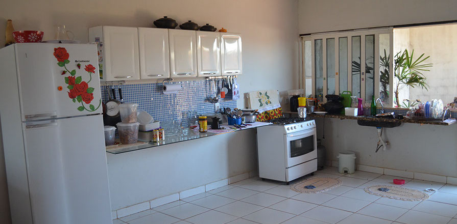 Na parte da casa onde Maria Luiza e sua mãe moram, as salas de televisão e a de jantar ocupam o mesmo cômodo, que ainda abriga a pia que seria da cozinha. Fogão, geladeira e demais eletrodomésticos ficam em um cômodo mais adiante, por onde as moradoras passam para chegar aos quartos.